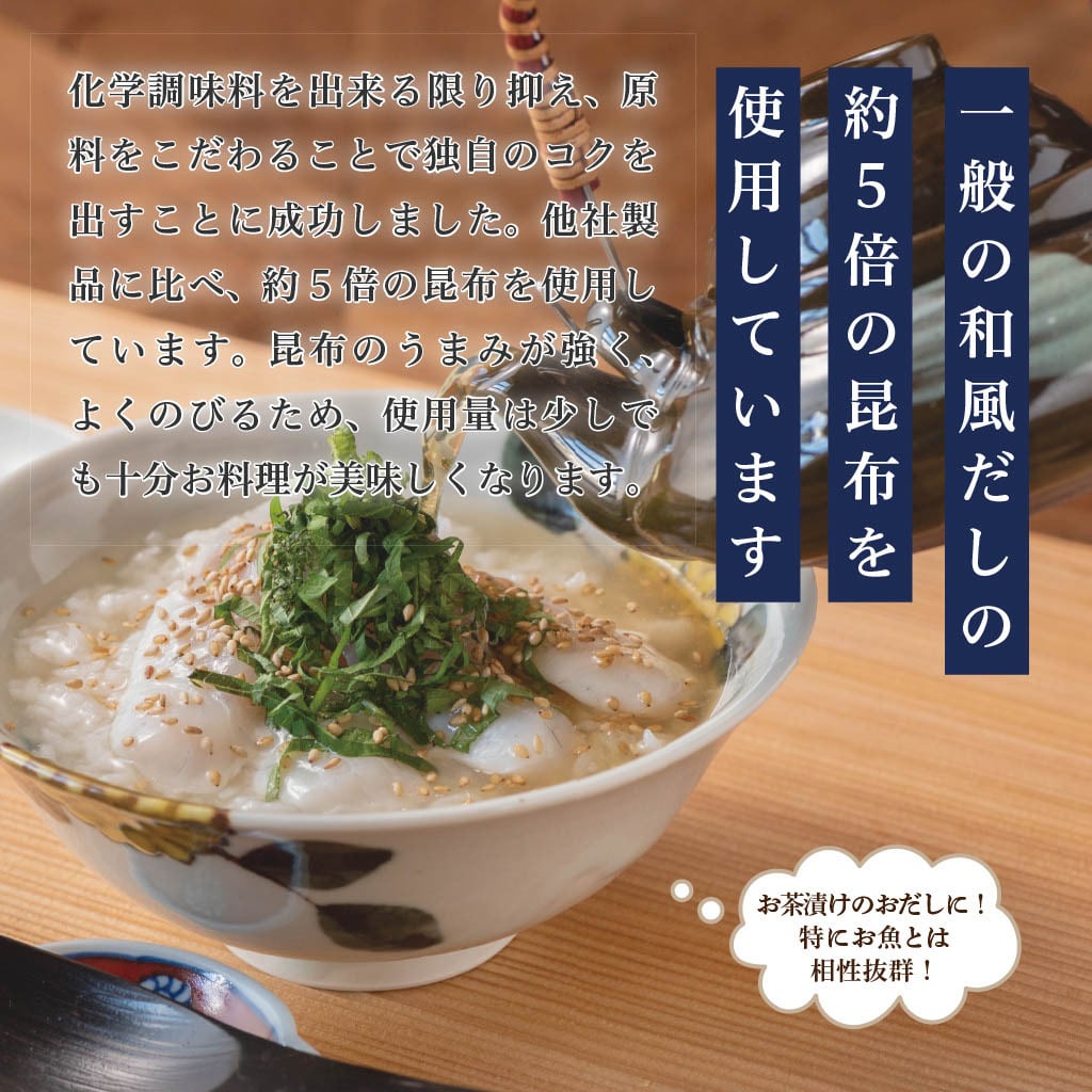 これ1本で料亭の味!本製品の主原料(製品中の約7割)が、工場で実際に抽出した「昆布だし」となっております。青森県大間産マグロ粉末と大間産真昆布を使用した、大間の魅力満載のだしです。「だしを取る」ことでしか引き出せない、昆布本来の風味が感じられると好評です。そのままお醤油の代わりとしても。和洋中問わず様々なお料理に手軽においしさをプラスします。ぜひ、お好みの濃さでお試しください。